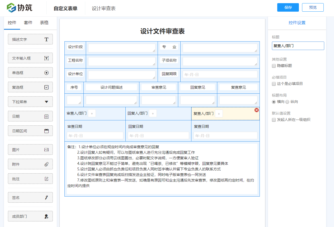 2、新增表单中添加审批意见的套件,方便快速创建审批表格,签名自动生成时间。