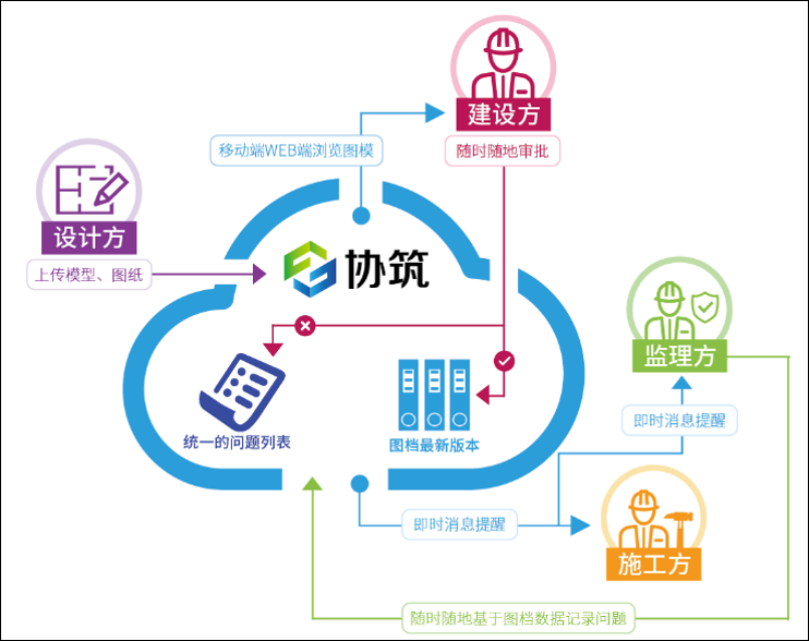 “协筑”作为一款云平台,致力于通过云技术实现工程项目各参建方之间工作的轻松协同,云平台在云端为每个工程项目提供一个协同空间,基于该协同空间组建虚拟项目协同团队,团队成员在统一的平台上共享信息、项目进展,沟通交流。他们可以上传图档到云空间并可控地与团队分享,各参与方通过账号登录可快捷读取、编辑图档并将最新信息实时同步。